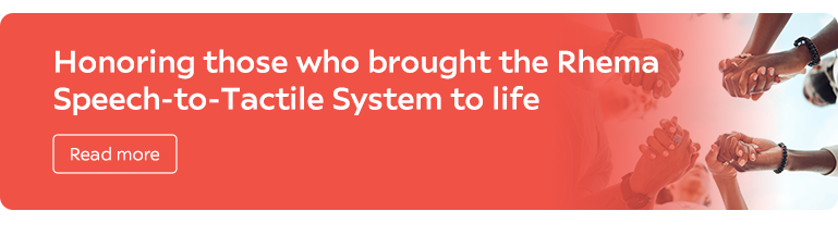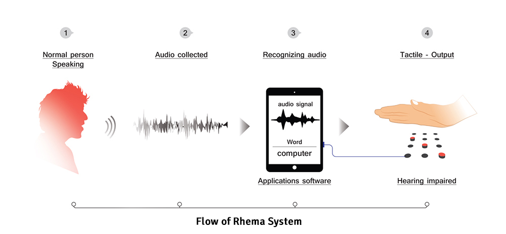 Rhema uses a uniquely designed tactile device that processes audible sounds into phonetic patterns when put together form words. These patterns lay subtle imprints on the user using a wearable device.